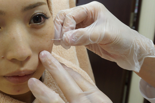従来の針とは全く違う、最新の針をご用意しました。1針目で開けた穴から、2針目の先端が丸いマジックニードルを挿入し、1点から広範囲に注入します。麻酔が入っているのでほとんど痛みを感じることなく治療できます。